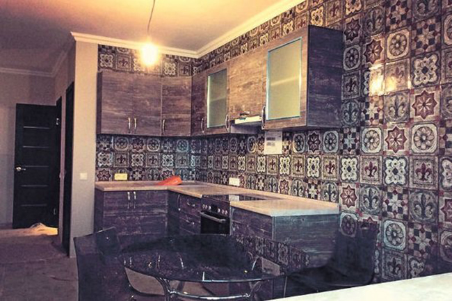 Кухня выполнена в темных тонах с восточным орнаментом на плитке.