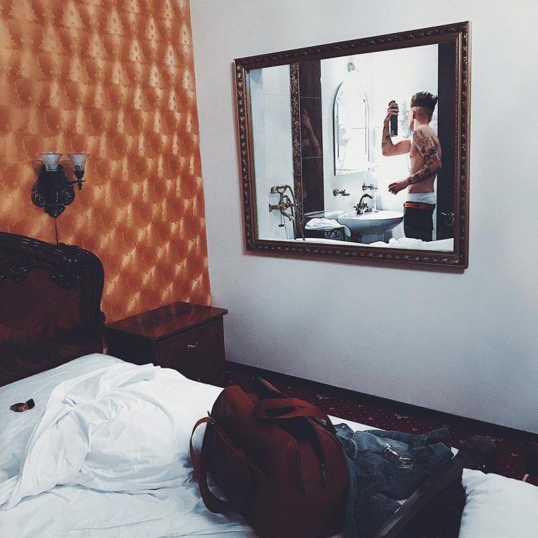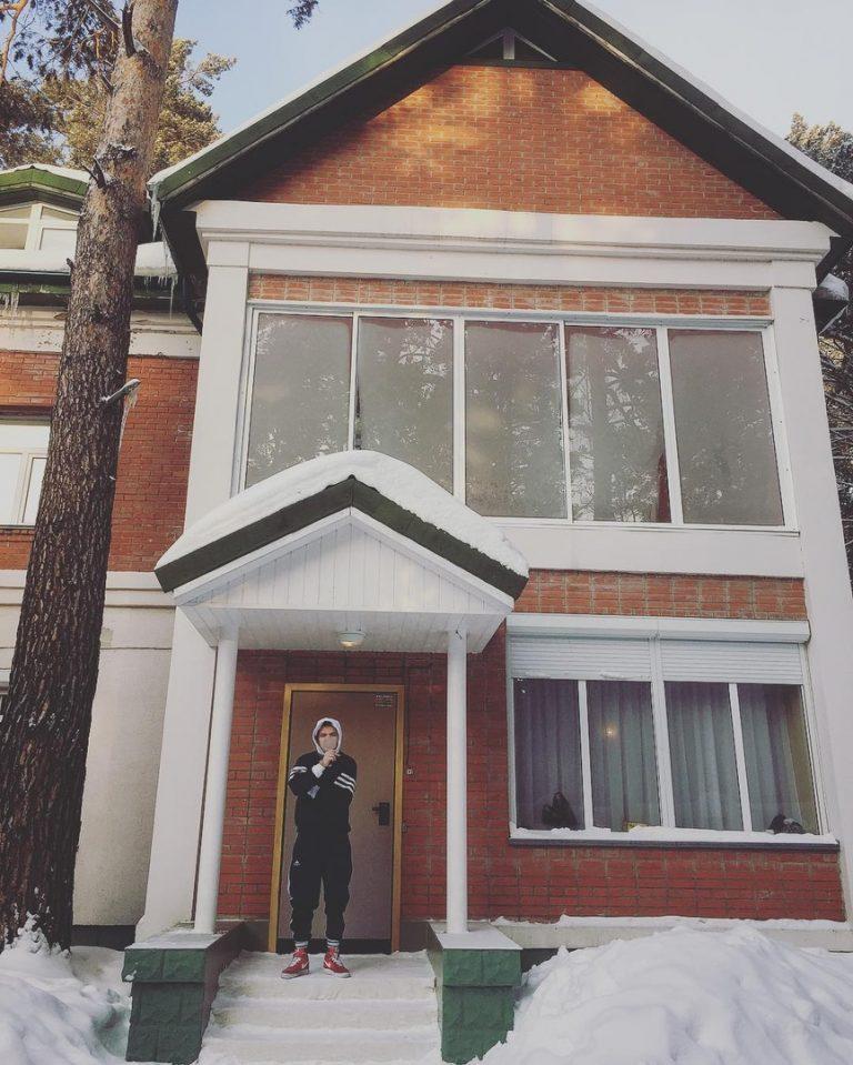 До переезда в столицу парень жил с родителями в Новосибирске. Интерьер его апартаментов простой: здесь в центре расположена большая двуспальная кровать. К ней примыкает миниатюрная прикроватная тумбочка. Вся мебель благородного темно-бордового оттенка, выполнена из натурального дерева. На одной из стен висит прямоугольное зеркало, помещенное в изящную узорчатую раму. Над кроватью размещен торшер, необходимый для комфортного чтения литературы перед сном. Стены комнаты комбинированы: украшены обоями и простой белой краской.