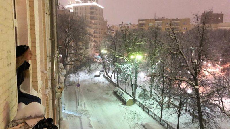 В дополнение ко всему, прекрасный вид из окна на заснеженную улицу в вечерних огнях.