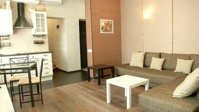 Квартира Алианы небольшая, но очень уютная. Дизайн интерьера оформлен в кофейных и белых тонах. Главным предметом зоны отдыха является диван со светлыми подушками. У него стоят два небольших передвижных диванных столика черного и белого цветов.
