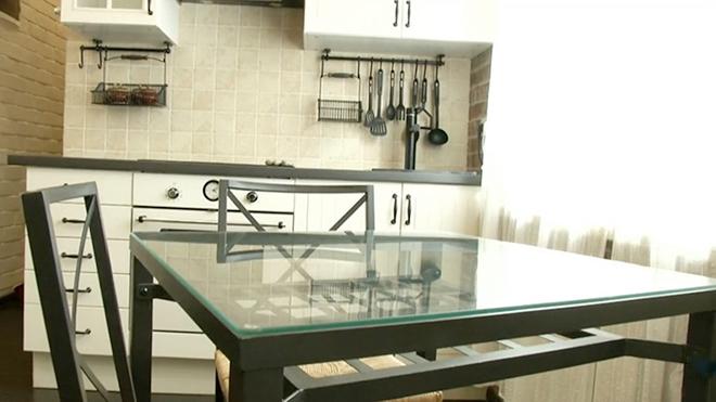 Напротив расположилась обеденная зона. Ее занимает металлический стол с двойной стеклянной столешницей и стулья также с металлическим каркасом. Сбоку от нее Алиана обустроила кухню. Зона для готовки и белые навесные шкафчики занимают небольшое место вдоль одной из сторон.
