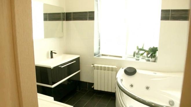 Санузел Алианы просторный и светлый. Темные вставки гармонируют с черно-белым умывальником и ванной. Кроме того, в ванной комнате есть большое окно, благодаря которому здесь всегда светло и солнечно.