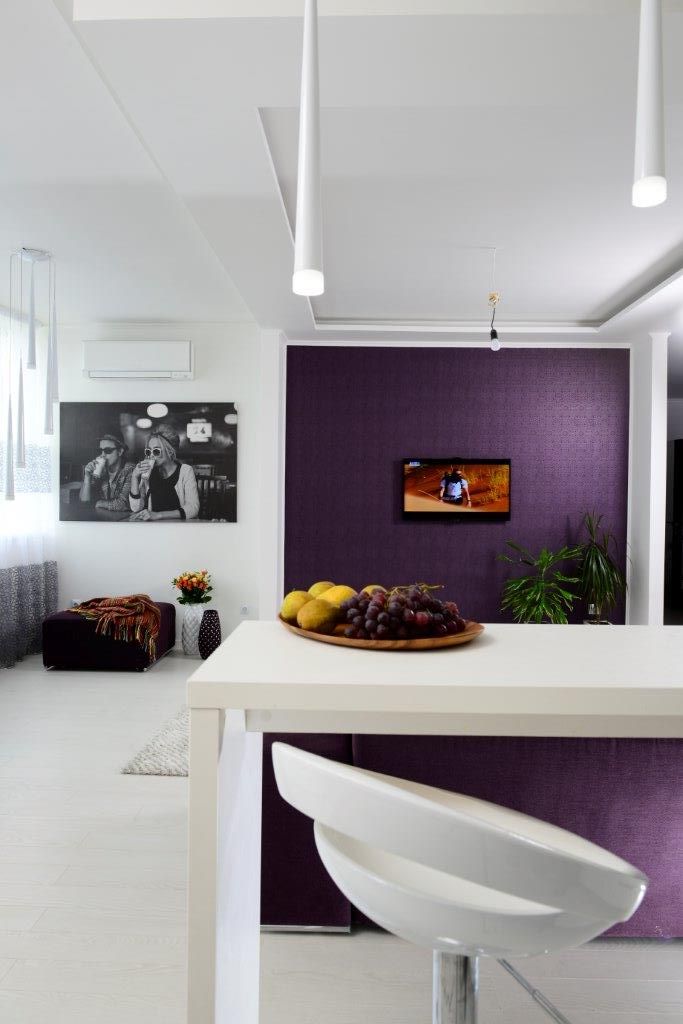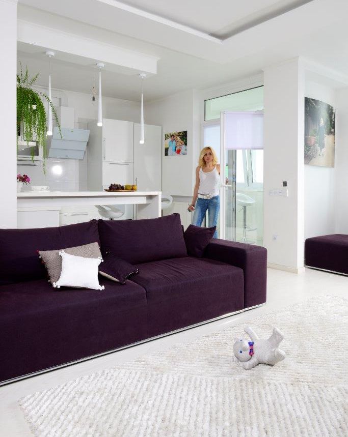 В центре комнаты – пурпурный диван. Ему вторит стена напротив барной стойки, оклеенная фиолетовыми бархатными обоями. Единственная вольность Лилии – графические узоры на фасаде мебели, напоминающие мыльные пузыри.