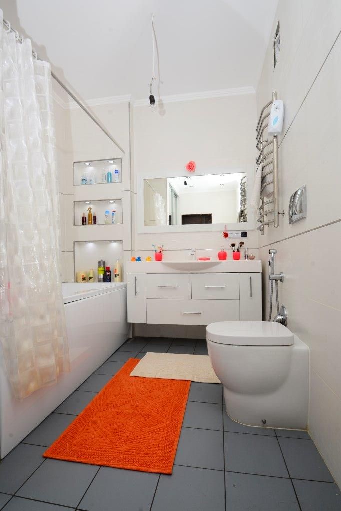 Ванная комната также оформлена в мягких кремовых тонах. Оживляют пространство множество разноцветных баночек и яркие полотенца.