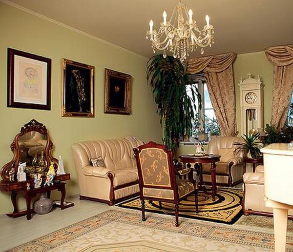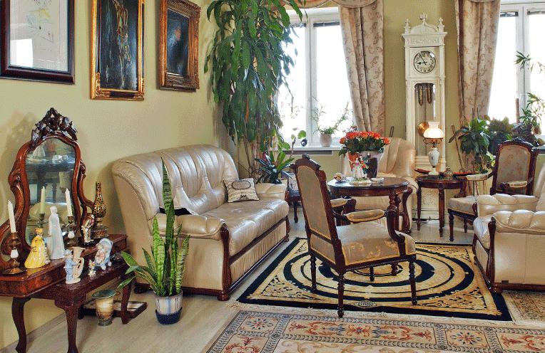 В интерьере гостиной, выполненной в английском стиле конца XIX-начала XX столетия, выделяется белый электрокамин с роскошной вазой и подсвечниками. Рядом — картина «Портрет неизвестного», привезенный из Ливана. Нельзя не заметить некоторого сходства человека на полотне с владельцем квартиры.