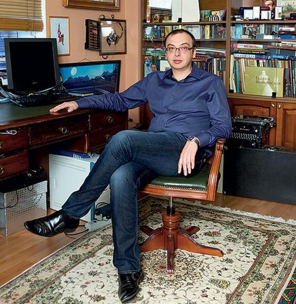В кабинете собраны старинные книги, зарисовки к спектаклям, вещи, обладающие своей историей. Найденные в сарае и отреставрированные кресла оказались точь-в-точь похожими на версальские экземпляры. На стене — три тарелки: ручная работа с гравировкой, дальше подарок Лужкова и тарелка маленького Димы.