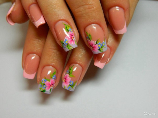 Красивые цветы на ногтях в профессиональном исполнении является лучшим аксессуаром для украшения рук. Очень стильно цветочная тема смотрится на разноцветном френче. Он предполагает окрашивание кончиков ногтей в любой оттенок. Такой маникюр может быть комбинированным, где линия улыбки выполняется двойной или тройной дугой.