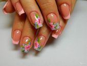 - Нежные ноготки в бело-розовой гамме. Здесь есть масса вариантов оформления. Можно сделать классический френч и дополнить его розовым или кремовым бантиком, или же наоборот, сделать розовый френч и добавить к нему бант с небольшой прорисовкой;
