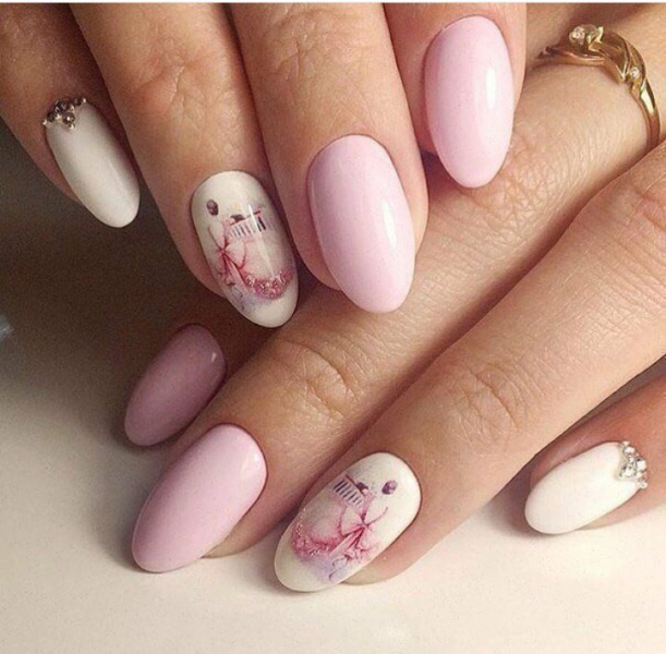 Многоцветные ногти, которые украшены стразами, рисунком и втиркой одновременно, могут смотреться хорошо, но примеры таких работ встретишь нечасто. Поэтому следует совмещать максимум две техники. Если вы выбираете двуцветные ногти, то украшайте их рисунком, но не клейте страз.