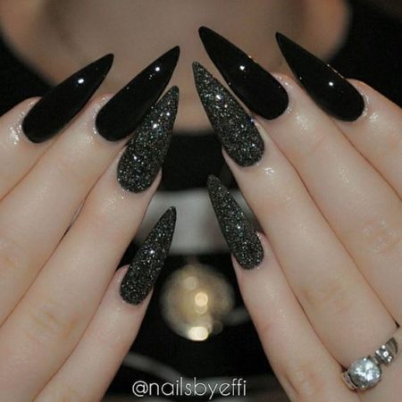 Черный маникюр – это классика своего жанра. Черный цвет идеально подойдет на острые ногти средней длины, так как на длинных он будет выглядеть достаточно мрачно и превратит ваши ногти в когти. Такой маникюр можно сделать однотонным или дополнить различными узорами, стразами, блестками, пайетками или наклейками.