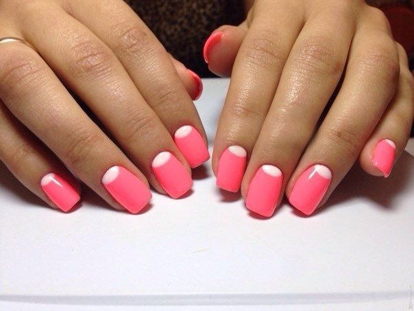 Нередко такой маникюр совмещается непосредственно с френчем, обычно цветным. В этом случае Вы покрываете всю розовую часть ногтевого ложа одним оттенком, а свободный край и зону лунулы другим.