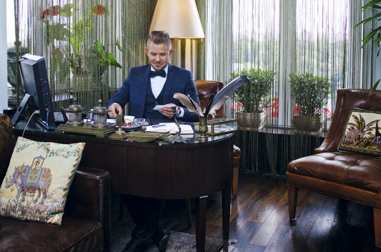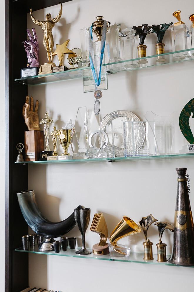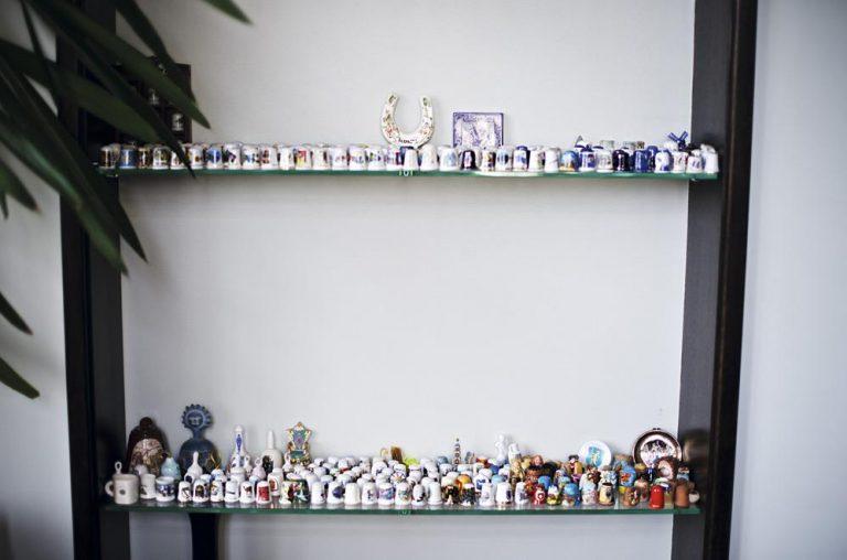 В кабинете звезды много дерева, массивной тяжёлой мебели, кожаный диван, большое полотно художника Степанова — память об отце. Основательность и монументальность умело разбавлены легкими полочками в нишах, с уютно расположившимися статуэтками, наградами, коллекцией напёрстков.