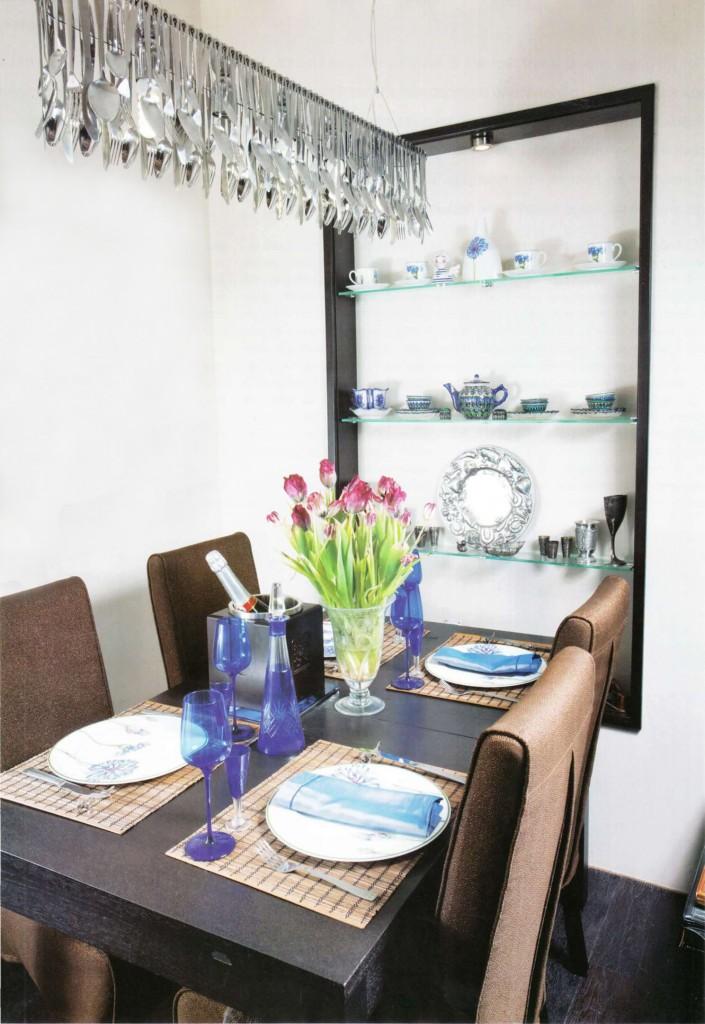 Стильная гостиная тоже оформлена в светлых тонах с контрастирующим деревянным полом. Украшением здесь служит оригинальная люстра над обеденной зоной в виде столовых приборов.