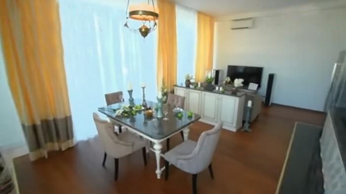 По задумке дизайнера для столовой изначально подбирался круглый стол. Но следуя за чёткими и простыми линиями, авторы решили установить роскошный квадратный стол из массива дерева с гранитной столешницей весом 150 кг.