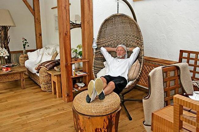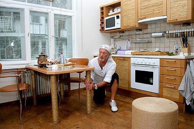 По фото видно, что писатель-сатирик был абсолютным фанатом декора из разных пород дерева. Изголовье кровати сатирика, кофейный столик и даже импровизированный стул из настоящего пня — все говорит о том, что писатель стремился быть ближе к природе и предпочитал стиль загородного дома с интересными элементами декора из необработанных природных фактур.