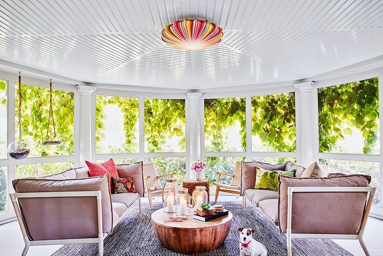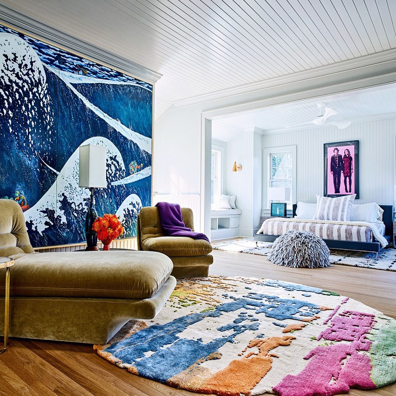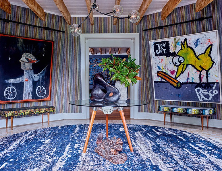Дизайном дома занимались талантливые Д. Филдсу и Д. Наэму. Каждая комната — настоящее произведение искусства. В помещении много ярких и необычных предметов, изучать которые можно часами. В поместье несколько гостиных комнат. Одна из них наполнена умиротворенностью, спокойными неброскими цветами и элементами. По периметру гостиной установлены большие панорамные окна. Весной отсюда открывается потрясающий вид: пространство утопает в яркой зелени и распустившихся цветах. Мебели здесь немного: 2 мягких небольших дивана на ножках, круглый стол, напоминающий деревянный пенек.