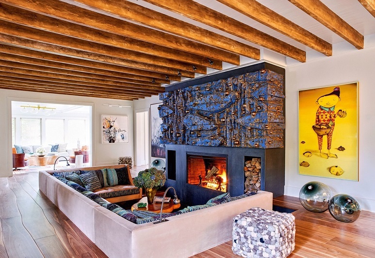 Еще одна гостиная оформлена в духе постмодернизма, техно и авангарда. Потолок украшен деревянными брусками приятного светло-коричневого оттенка. Главное место в комнате принадлежит камину. Рядом с ним расположен вместительный П-образный мягкий диван. Стены в этой гостиной украшены яркими футуристическими картинами. Большие шары в виде мыльных пузырей, необычные торшеры — актер знает, как удивить гостей.