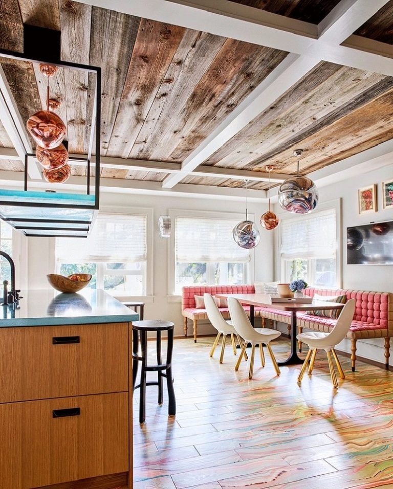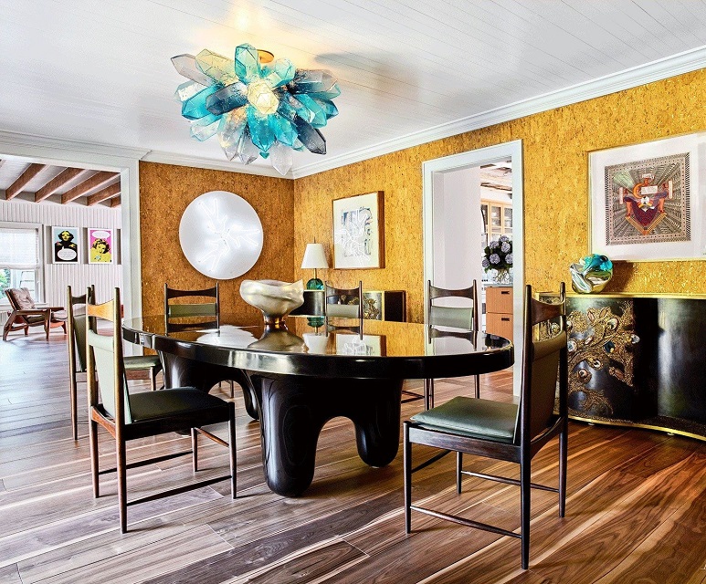 В столовой несколько обеденных зон: барная стойка и небольшой прямоугольной стол, окруженный мягким угловым диваном и стульями. Потолки здесь обшиты натуральным деревом, оформлены в эко-стиле. Необычные футуристические торшеры, свисающие с потолка, навевают мысли о неземных галактиках.