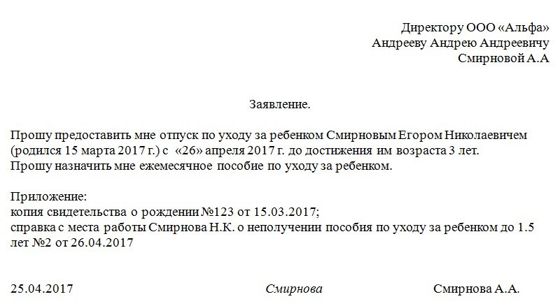 Если сотрудница желает выйти на работу на неполный день, при этом используя отпуск по присмотру за малышом, ей необходимо оформить заявление на имя руководителя субъекта бизнеса.