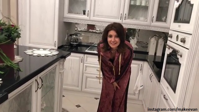 Кухня звезды сделана в стиле Прованс. Здесь расположен большой белый гарнитур со встроенной кухонной техникой. Столешницы гарнитура и стол-остров, установленный в середине, имеют черный цвет, прекрасно гармонирующий с белым.