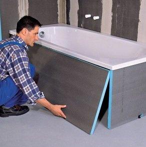 Для создания такого сооружения преимущество отдается кирпичу, влагостойкому картону, фанере, а для облицовки – керамической или полихлорвиниловой плитке, искусственному камню и прочим материалам. Некоторыми производителями предлагаются ванны, дополненные готовыми пластиковыми или пенополистироловыми конструкциями, что является наиболее правильным решением.