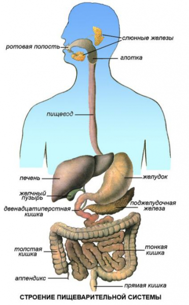 Пища поступающая в организм сначала измельчается зубами в ротовой полости, затем по пищеводу попадает в желудок, где происходит ее переваривание, далее, в тонком кишечнике под воздействием ферментов продукты пищеварения распадаются на отдельные компоненты, а в толстом кишечнике происходит формирование кала (остаточных продуктов пищеварения), который в конечном счете подлежит эвакуации из организма.