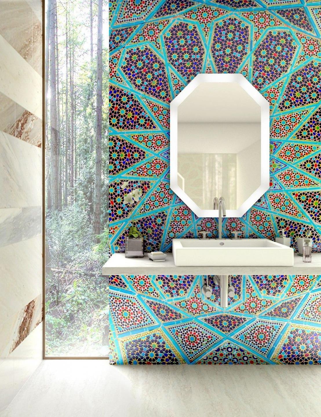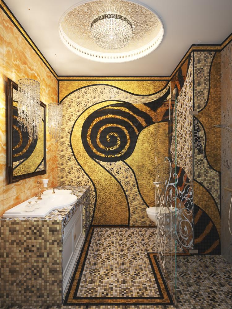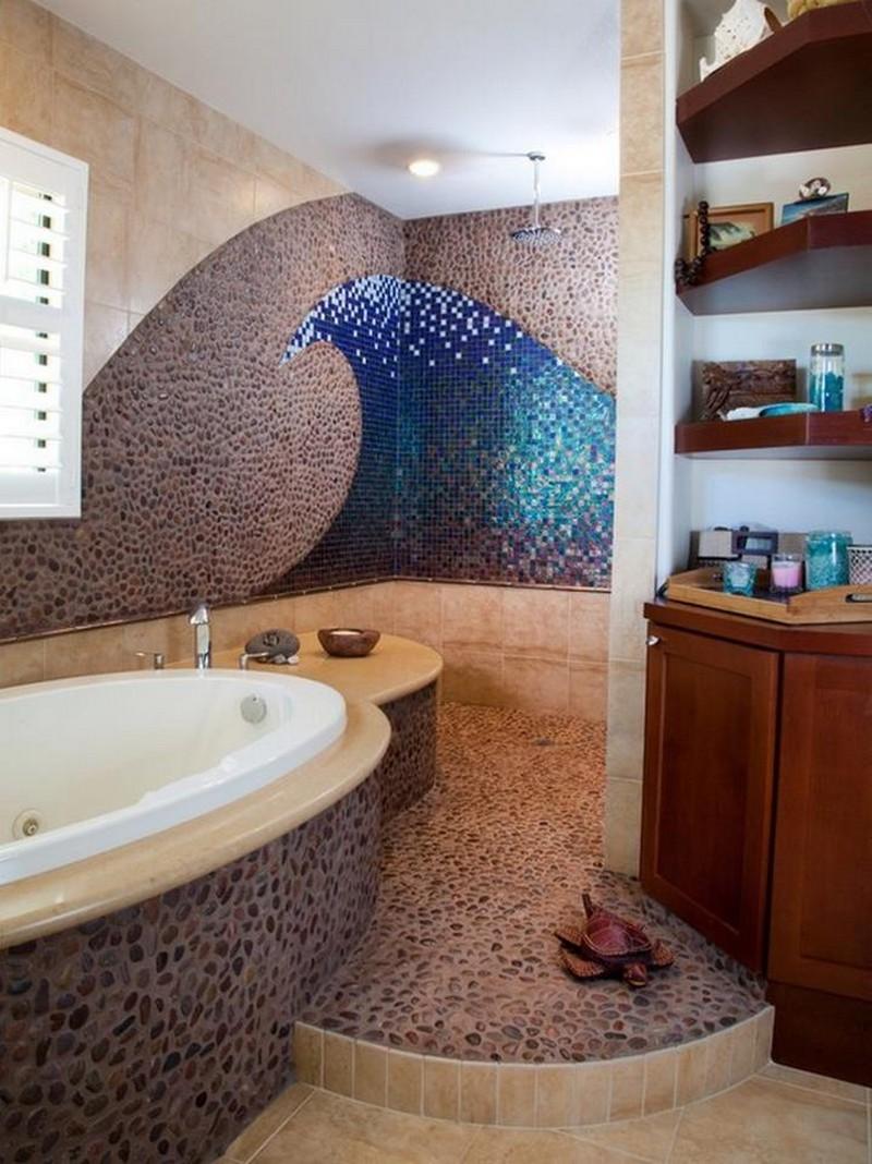 Из плиточной мозаики можно выложить абсолютно любой рисунок и узор. Скучная ванная комната превратится в настоящий шедевр, стоит только подключить фантазию.
