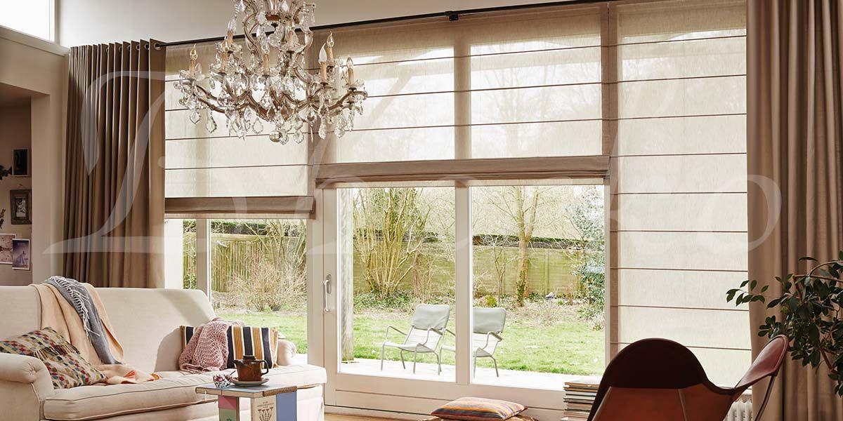 Для начала можно рассмотреть римский тип. Он подразумевает, что ткань имеет равномерные горизонтальные складки. Если такие шторы аккуратно сложены, они будут выглядеть красиво и в опущенном, и в поднятом положении.