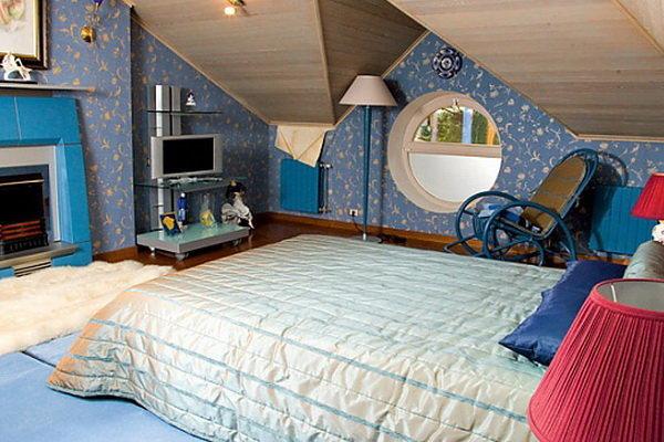 Для гостей Лещенко выделил комнату на мансардном этаже. Она оформлена в романтическом, светло-голубом цвете. Электрический камин, а также просторная двуспальная кровать делают комнату по-домашнему уютной.