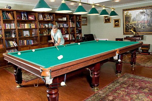 В просторной бильярдной преобладает нежный бирюзовый цвет. Здесь много книг и картин в позолоченных рамках.