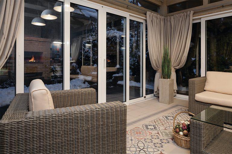 В просторной гостиной много окон и света. Здесь друзья семьи могут полюбоваться потрясающей природой, виднеющейся из окон комнаты.