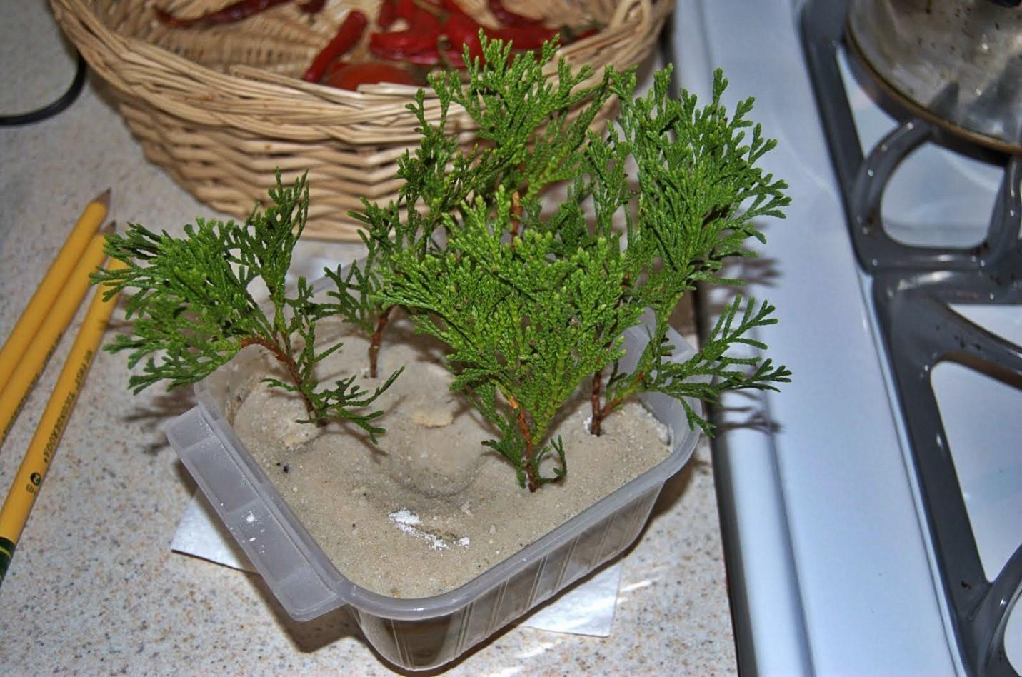 Для черенкования туи зимой посадочный материал помещают в емкости, имеющие небольшую глубину. Если черенки планируется высадить в песок, его необходимо прокипятить в течение 5 минут, чтобы удалить болезнетворные бактерии. Дренаж делают из гальки небольшого размера или керамзита. На него сверху насыпают песок или почвенную смесь.