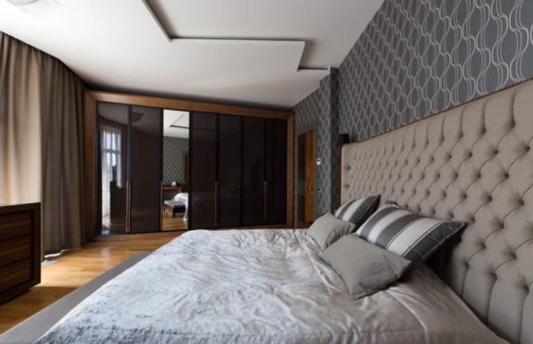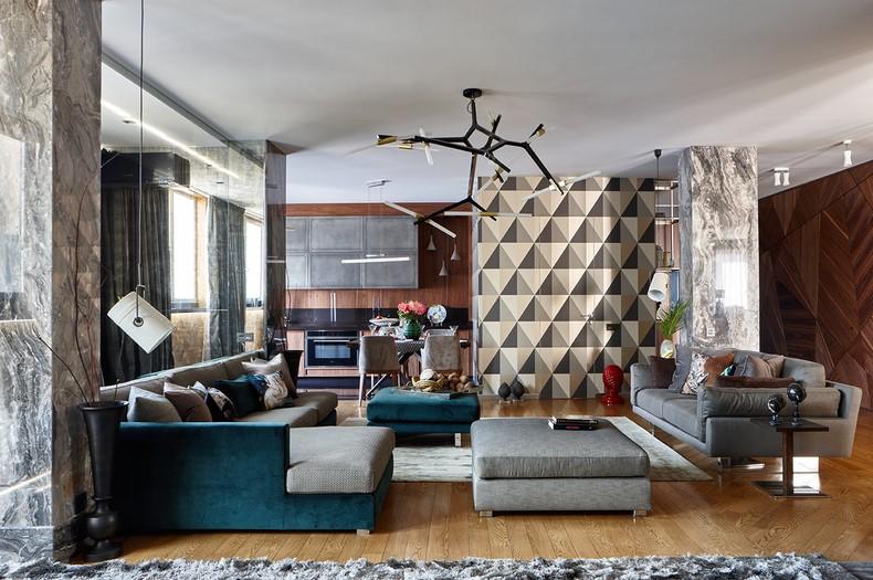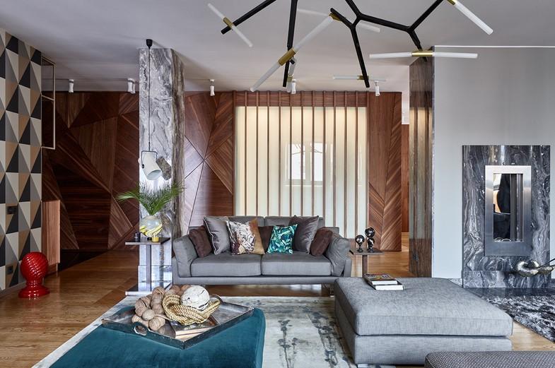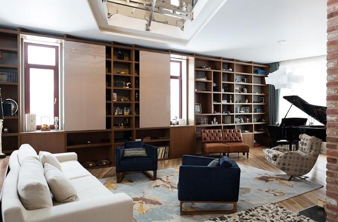 Стиль интерьера вышел урбанистическим с использованием спокойных и приглушенных оттенков. В гостиной музыканта стоит большой черный рояль, над которым висит оригинальный светильник в виде геометрических линий.