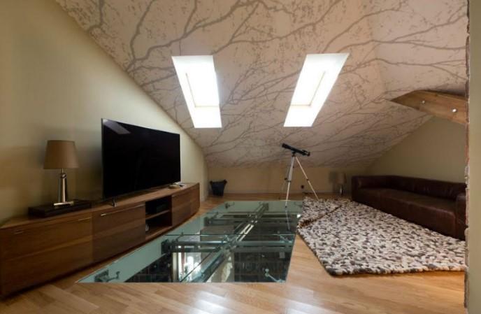 В комнате стоит мебель из кожи и мягких материалов. В качестве предметов декора повсюду расставлены любимые вещи хозяина: макеты кораблей, книги и фотографии. Есть на первом этаже и металлический камин.