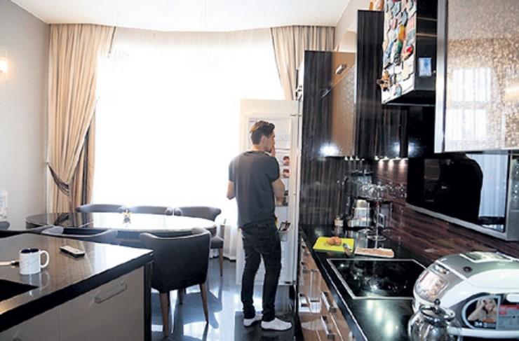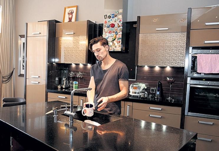 Внизу также расположена кухня и обеденная зона. Для них были выбраны кофейно-ореховые и черные цвета. Кухня занимает небольшую площадь, здесь можно найти самую необходимую мебель: настенные шкафчики, панель для готовки, холодильник. Панель умывальника, как и обеденная мебель, выполнена в черном цвете и создает контраст с кофейными оттенками занавесок и шкафов. Светильники певец выбрал прозрачные, из стеклянных подвесок.