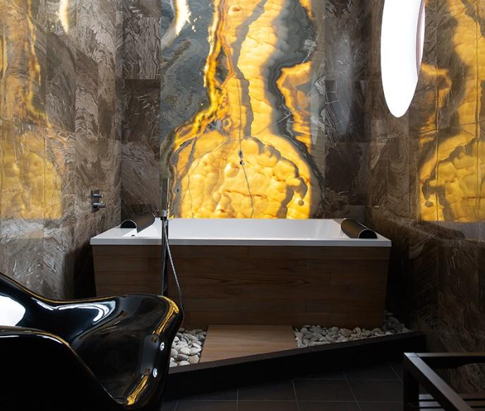 Ванная комната выглядит настоящим произведением искусства. Ее стены отделаны абстрактным панно из натурального оникса. Рисунок камня напоминает огонь и комические узоры.
