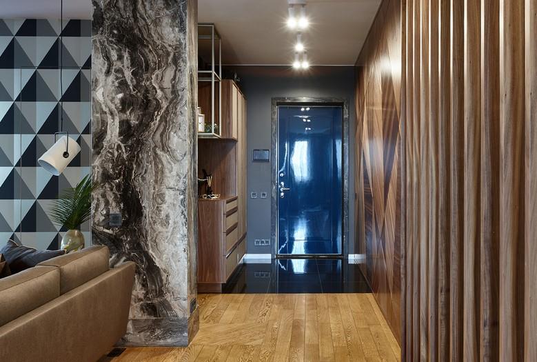 Гостиная не перегружена мебелью. В ней находится диван и шкаф цвета мокко, ковры с коричнево-бежевыми узорами и небольшой стеллаж. Несущие колонны комнаты выполнены из серого мрамора с прожилками на камне.