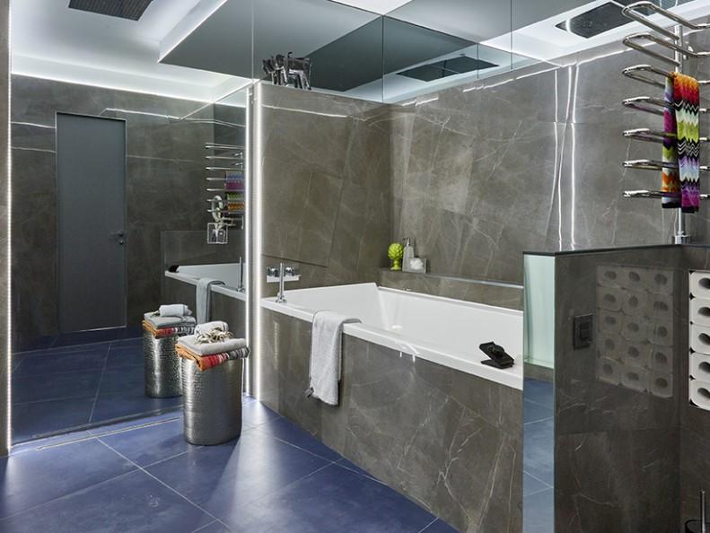 Ванная комната отделена от гостиной стеклянными матовыми панелями. Это позволяет ей вливаться в общее пространство, и создает уютную обстановку за счет проникающего из других комнат света. Сами стены отделаны серым гранитом, который идеально гармонирует с белой поверхностью сантехники.