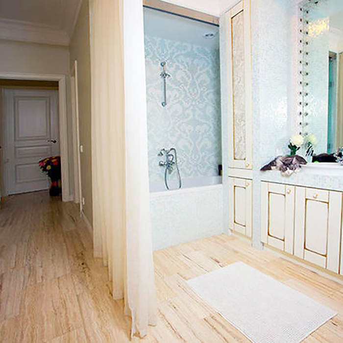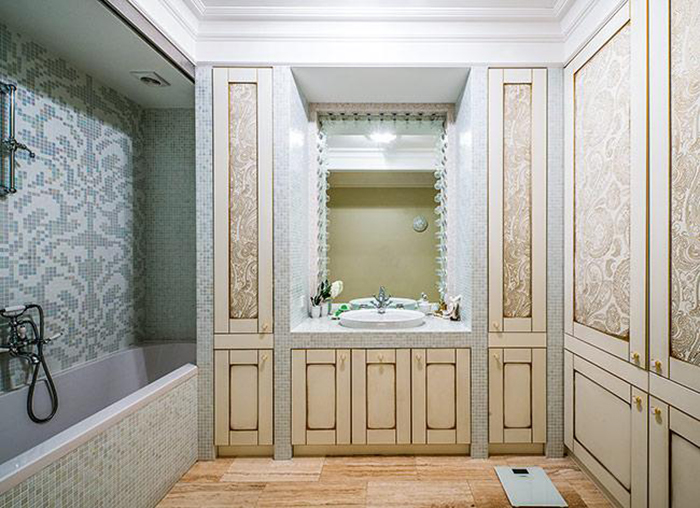 Вся квартира, за исключением туалета, выполнена в светлых мягких тонах. Выбор тёмной гаммы для туалета – случайность. Певице полюбился светильник, который никак не вписывался в светлый интерьер. Девушка определила его в туалет, и сделала соответствующее оформление. Ванная комната светлая и функциональная: душ, раковина и множество мест хранения.