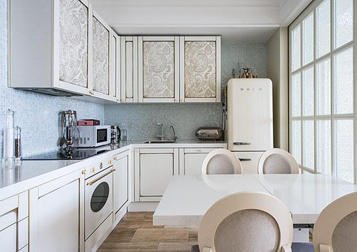 Бежевый кухонный гарнитур в стиле прованс изготавливался на заказ. За плитой МакSим проводит немного времени, поэтому кухне не отведена какая-то особенная роль в квартире.