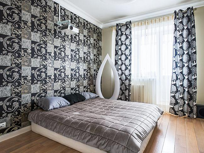 Главное место отдыха хозяйки, конечно, спальня. Здесь вокруг просторной кровати расположились проектор для просмотра фильмов, гитара и синтезатор – атрибуты гармонии творческого человека.