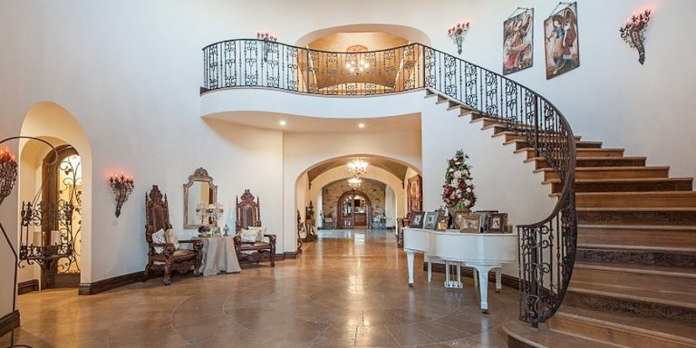 Просторный холл украшает лестница. Главная изюминка — кованая балюстрада и небольшой балкон. В холле расположился и белый рояль. Отличительной особенностью гостиной, совмещенной с кухней, является каменный пол и потолок в виде полусферы, который украшают деревянные балки. Все детали интерьера объединены общим средневековым стилем.