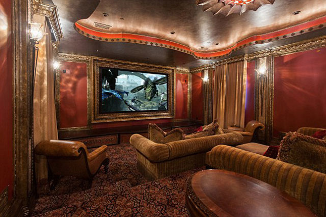 Комната домашнего кинотеатра выполнена в бордовых цветах. Чтобы создать уютную атмосферу, установлены диваны, обитые кожей и бархатом.