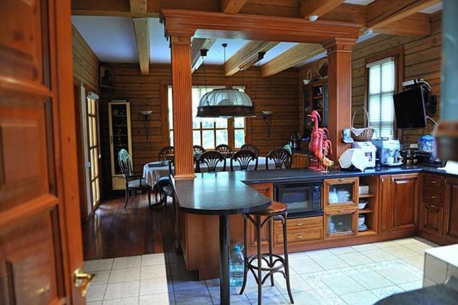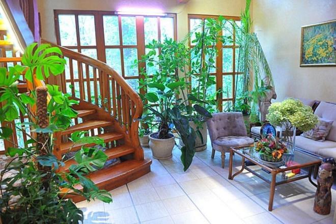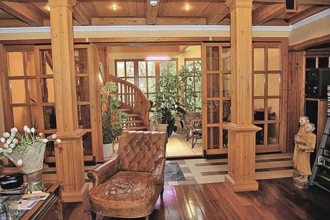 Интерьер создан с использованием натуральных материалов. В большинстве комнат преобладает деревянная отделка. Также внутри помещения имеются зеленые растения. Мебель идеально сочетается с материалами отделки.