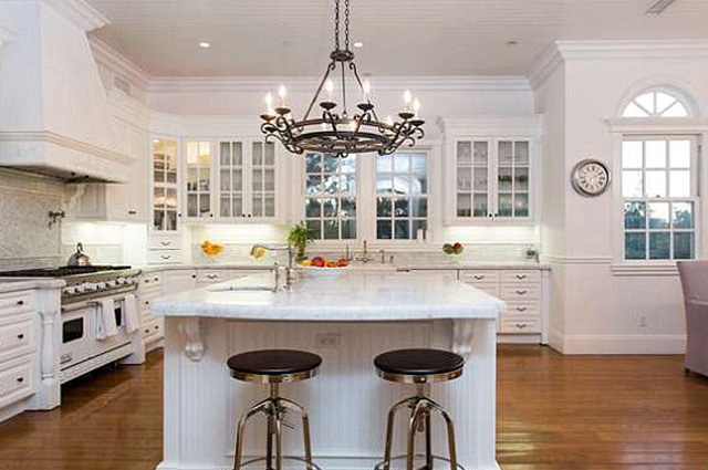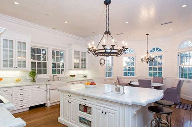 На кухне установлен роскошный белый гарнитур со столешницами из мрамора. Есть барный уголок. Столовая размещена в эркере.