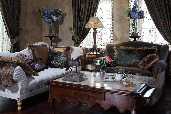 - массивная мебель, украшенная резьбой; толстая фигурная обивка диванов и кресел.