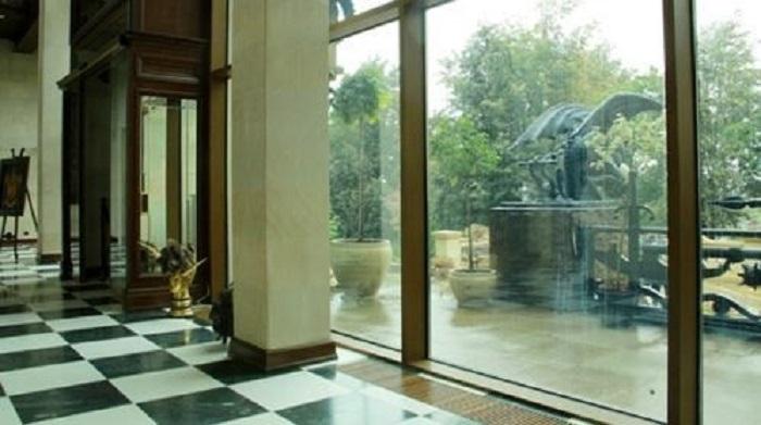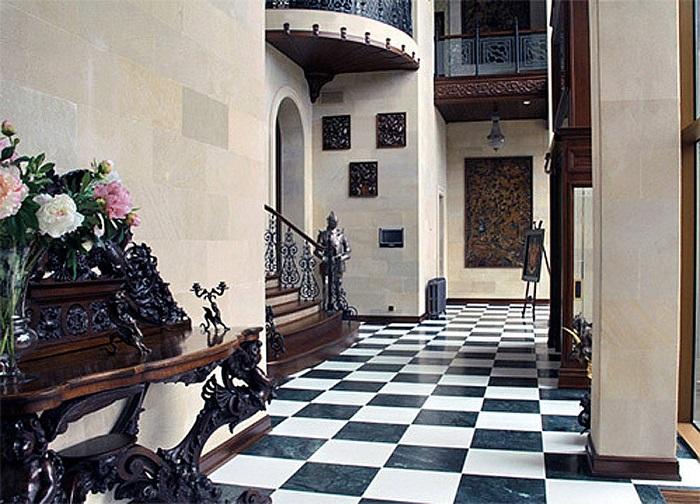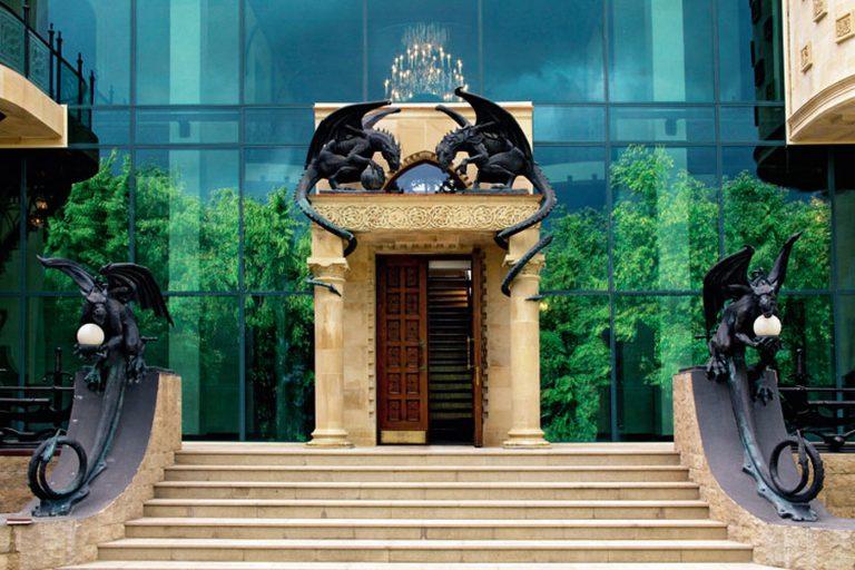 Главную лестницу, а также входные двери в замок охраняют 4 скульптуры гарпий и драконов. Панорамное остекление установлено на центральную стену на уровне 2-х этажей.