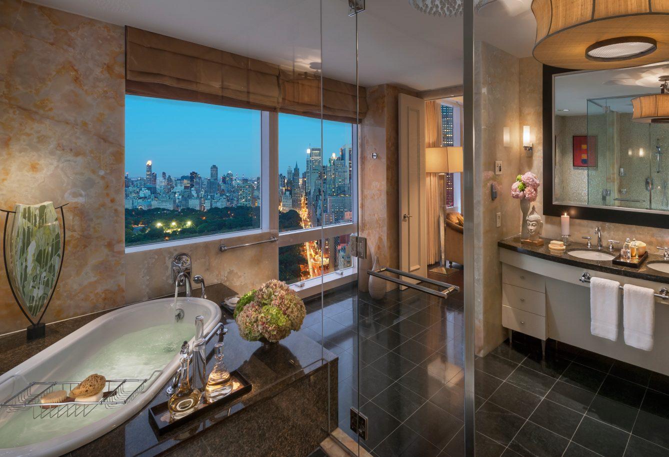 Ванная с мраморными стенами и видом на Нью-Йорк.