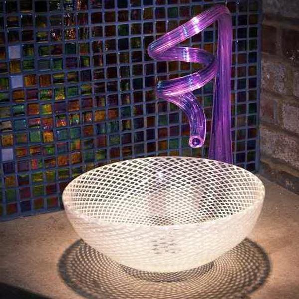 «Сетчатая» раковина и кран в ультрафиолетовых тонах — ещё оно необычное решение для современной ванной.