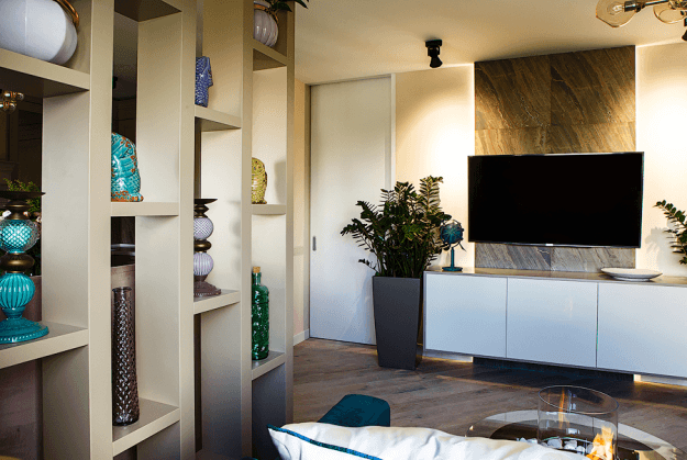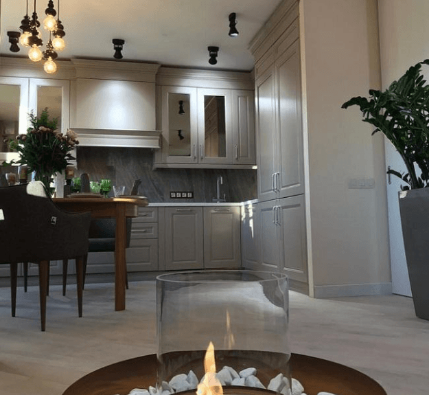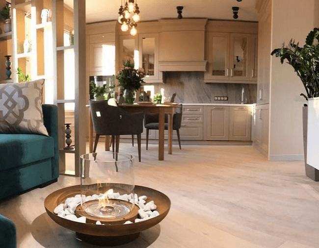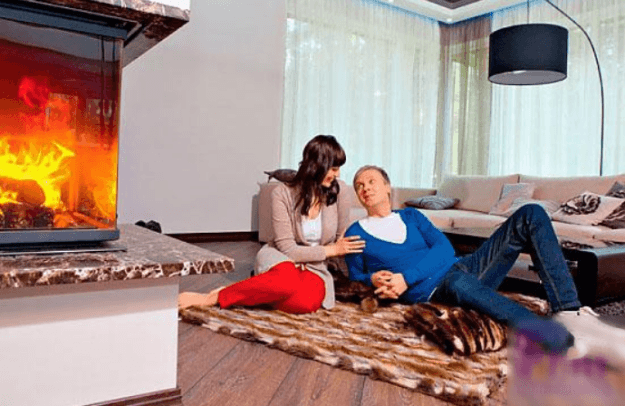 Гостиная получилась просторной. Из мебели здесь только большой угловой диван, журнальный столик и напольный торшер. Электрический камин придает комнате еще больше уюта. Пол украшен ковром из натуральной шерсти.